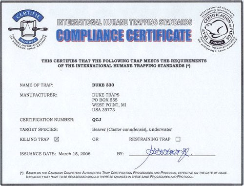 Duke Body Gripping Traps are rotating jaw traps used to quickly catch and dispatch wild animals. This style of trap was developed during the 1950's and has steadily increased in use due to the versatility and effectiveness of the trap design. Duke Body Traps such as sizes #330 and #280 are widely accepted by state and federal wildlife agencies as the most effective humane traps for beaver population control.