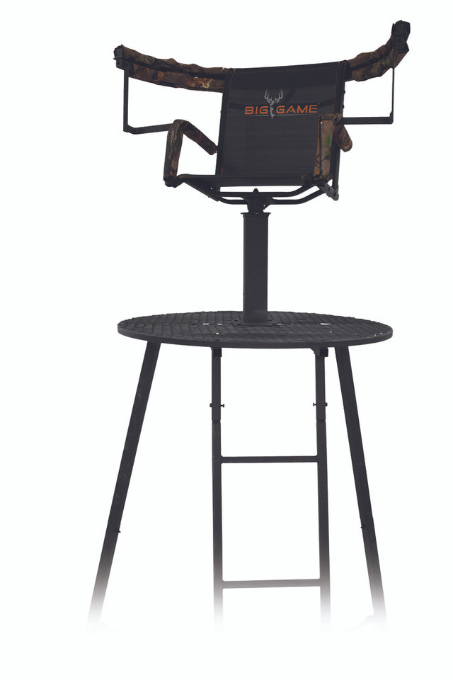 Get up above it all with the The Apex Tripod Stand from Big Game Treestands. This sturdy, all-steel 12.5' stand makes hunting easier with a seat and shooting rail that rotate 360°, allowing you to quickly and quietly draw a bead on any deer that crosses your path. The padded shooting rail flips back out of the way for bowhunters and comes off completely when needed. Seat: 19"x14". Backrest cushion: 19"x18". Platform: 36" diameter. Weight: 115 lbs. Maximum weight capacity: 300 lbs.