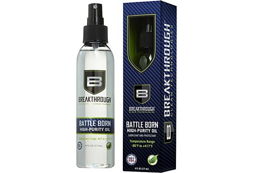 The Breakthrough Clean Technologies® Battle Born High-Purity Oil, is a general-purpose low-viscosity oil that is a lighter version of our bestselling HP Pro Oil, is a blend of high-quality, 100% synthetic gun cleaning oils. This non-toxic, odorless lubricant is treated with the highest quality anti-rust, anti-foam, and anti-wear additives to provide ultimate and lasting corrosion protection and lubrication under extreme pressure and a broad temperature range (from -90°F to 417°F).