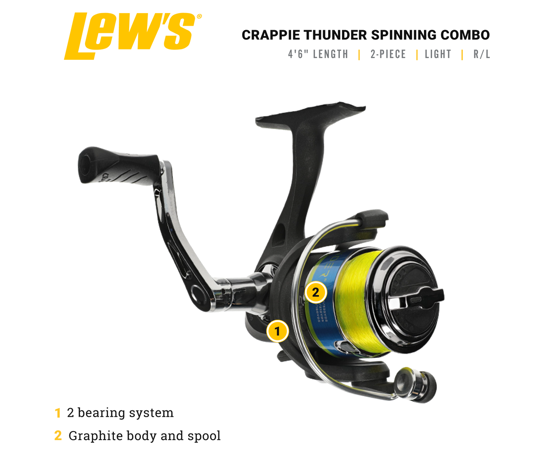 Featuring a premium two-piece graphite rod blank and graphite reel frame for ultimate durability and strength, the new Crappie Thunder® Spinning Combos are built for a new generation of crappie anglers who fish hard and demand the best. Equipped with the comfortable EVA handle for exceptional comfort and durable graphite reel seat for lightweight handling.